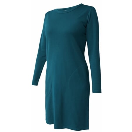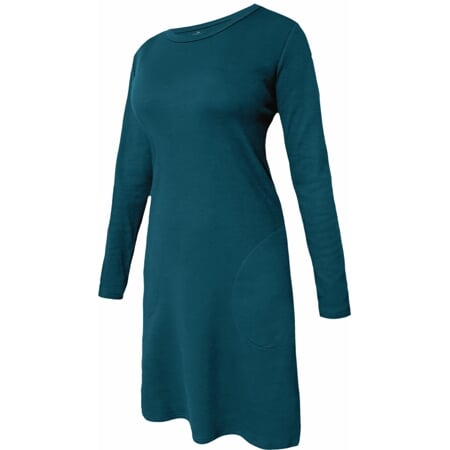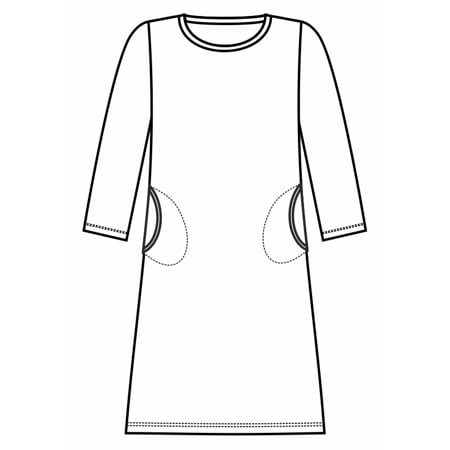 Pohodlný volnější střih s dlouhými rukávy a kulatým, úzce olemovaným výstřihem. Výrazným prvkem šatů jsou praktické kapsy na bocích, s olemovanými okraji.