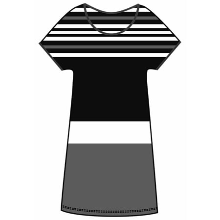 Letní dámské šaty ve slušivém černo-bílo-červeném proužkovaném dezénu. Volný střih se spadlými kimonovými rukávy. Efektní lemování v černé barvě, použité na kulatý výstřih a okraje rukávů.