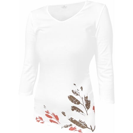 Elegantní dámské tričko s tříčtvrtečními rukávy a slušivým oválným výstřihem, který je úzce olemovaný. Na levém předním boku je natištěný jemný dvoubarevný motiv.