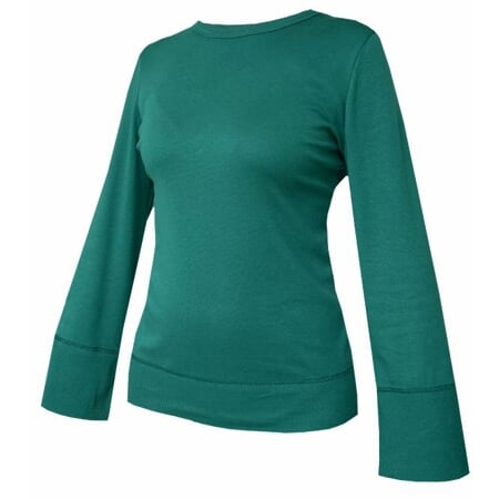 Elegantní dámské tričko s dlouhými, módně rozšířenými rukávy. Slušivý kulatý výstřih je olemovaný. Rukávy a dolní okraj trička jsou zakončené lemem v žebrové vazbě.