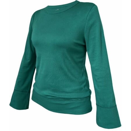 Elegantní dámské tričko s dlouhými, módně rozšířenými rukávy. Slušivý kulatý výstřih je olemovaný. Rukávy a dolní okraj trička jsou zakončené lemem v žebrové vazbě.