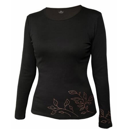 Elegantní dámské tričko s dlouhými rukávy a slušivým, úzce olemovaným výstřihem. V levé části předního dílu a na levém rukávu je natištěný jemný lístečkový motiv. Pružný oboulícní úplet s obsahem modalové složky je velmi příjemný na tělo.