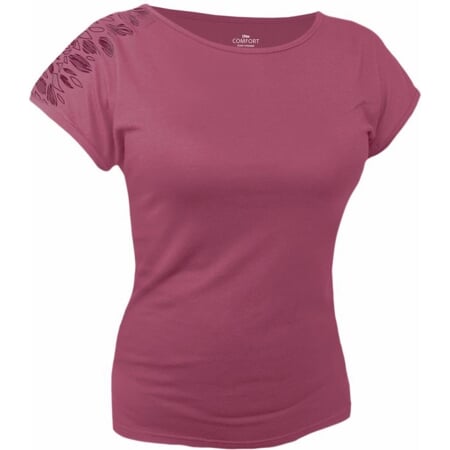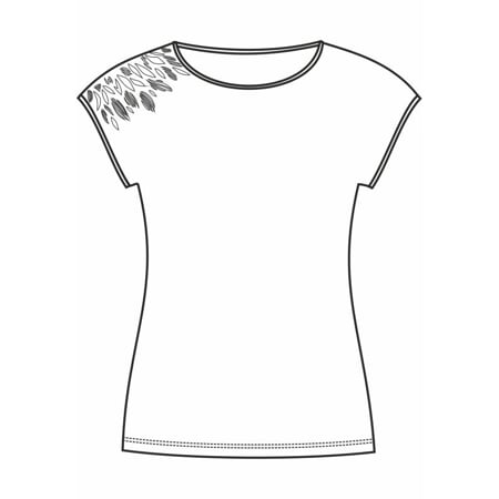 Dámské tričko se spadlými kimonovými rukávy a kulatým výstřihem, jemně olemovaným. Jednobarevný lístečkový potisk na pravém rameni.