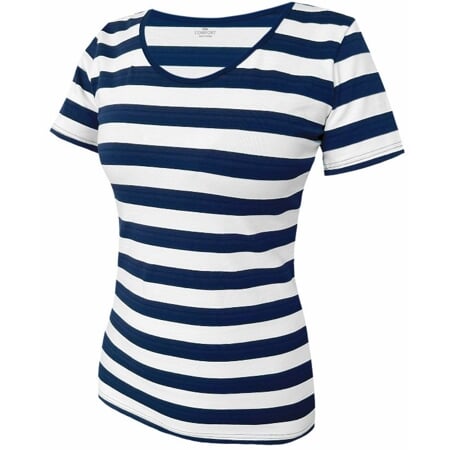 Dámské letní tričko s dezénem modrobílých proužků. Klasický střih s krátkými rukávy a kulatým výstřihem, který je úzce olemovaný.