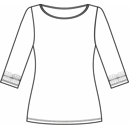 Elegantní dámské tričko s tříčtvrtečními rukávy a slušivým lodičkovým, úzce olemovaným výstřihem. Dolní kraj rukávů zdobí jemný tištěný motiv, imitující krajku. Pružný oboulícní úplet s obsahem modalové složky je velmi příjemný na tělo. Složení: 48% bavlna, 48% modal, 4% elastan.
