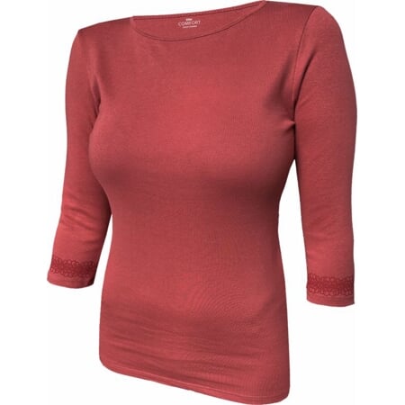 Elegantní dámské tričko s tříčtvrtečními rukávy a slušivým lodičkovým, úzce olemovaným výstřihem. Dolní kraj rukávů zdobí jemný tištěný motiv, imitující krajku. Pružný oboulícní úplet s obsahem modalové složky je velmi příjemný na tělo. Složení: 48% bavlna, 48% modal, 4% elastan.