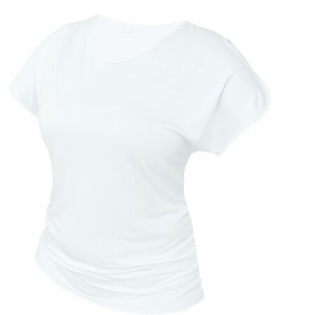 Dámské letní tričko kimonového typu s úzce olemovaným kulatým výstřihem. Vzdušný střih, pohodlný a lichotící postavě, se zajímavým střihovým řešením na ramenou, kdy jsou zakulacené a úzce olemované okraje rukávků bodově přichycené k sobě a vytváří tak na ramenou decentní průstřihy.