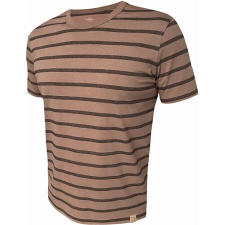 Pánské tričko klasického střihu s krátkými rukávy, kulatým olemovaným výstřihem a slušivým proužkovaným dezénem. Módní odstín hnědé barvy je doplněn úzkými černými proužky. Svěží vzhled doplňuje ozdobná etiketka v přírodních odstínech béžové.