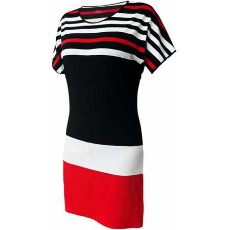 Letní dámské šaty ve slušivém černo-bílo-červeném proužkovaném dezénu. Volný střih se spadlými kimonovými rukávy. Efektní lemování v černé barvě, použité na kulatý výstřih a okraje rukávů.