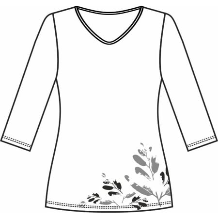 Elegantní dámské tričko s tříčtvrtečními rukávy a slušivým oválným výstřihem, který je úzce olemovaný. Na levém předním boku je natištěný jemný dvoubarevný motiv.
