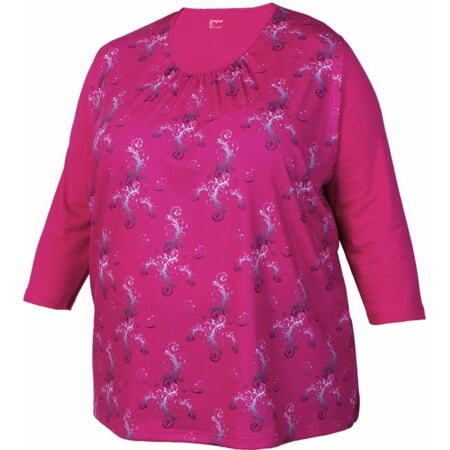 Dámské tričko ve větších velikostech pro plnější postavy. Klasický střih je přes boky mírně rozšířený a má oválný, úzce olemovaný výstřih, v dolní části přiřasený. Rukávy jsou klasického střihu v tříčtvrteční délce. Přední díl je celoplošně potištěný drobnými lístečkovými motivy s využitím přechodového vybarvení od nejsvětlejšího tónu barvy k nejtmavšímu. Na základ trička je použit příjemný elastický materiál ve složení 96% bavlna, 4% elastan. Potištěný díl je z mikropolyesteru.