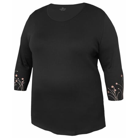 Dámské tričko ve větších velikostech pro plnější postavy. Klasický střih je přes boky mírně rozšířený a má oválný, úzce olemovaný výstřih. Rukávy jsou klasického střihu v tříčtvrteční délce, na okrajích ozdobeny jemným tiskem. Pružný oboulícní úplet s obsahem modalové složky je velmi příjemný na tělo.