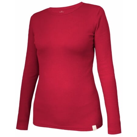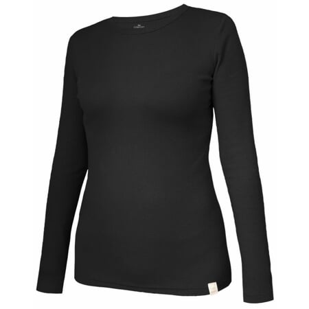 Dámské tričko klasického střihu s dlouhými rukávy a kulatým výstřihem, který je úzce olemovaný.