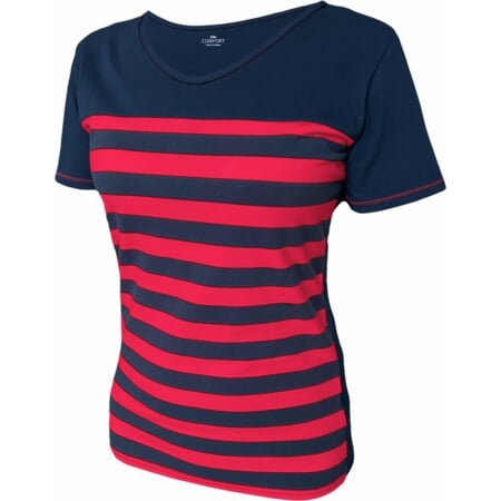 Dámské letní tričko klasického střihu s krátkými rukávy a kulatým výstřihem, který je úzce olemovaný. Základ trička je tmavě modrý, spodní přední díl je pruhovaný v kombinaci tmavě modrých a červených pruhů.