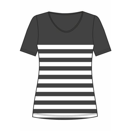 Dámské letní tričko klasického střihu s krátkými rukávy a kulatým výstřihem, který je úzce olemovaný. Základ trička je tmavě modrý, spodní přední díl je pruhovaný v kombinaci tmavě modrých a bílých pruhů. Tuto svěží letní kombinaci doplňuje červený odstín použitý u výstřihu a ozdobného prošití rukávů.