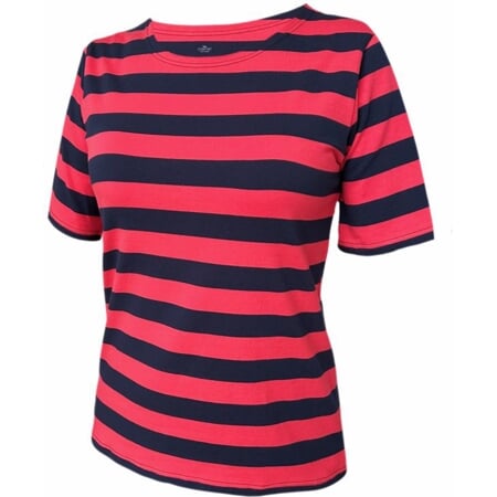 Dámské letní tričko v červenomodrém proužkovaném dezénu. Tričko má volnější střih, kulatý výstřih a rukávy, které sahají k loktům.