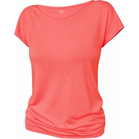 Dámské tričko s krátkými spadlými rukávy kimonového střihu a úzce olemovaným výstřihem. Slušivý volný střih, u kterého je spodní kraj zakončen řasením úzkou gumičkou, která drží tričko „podkasané“.