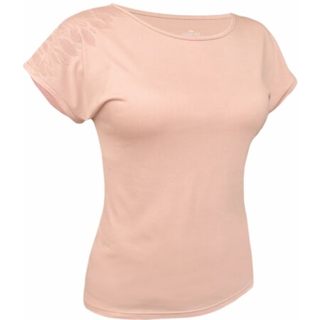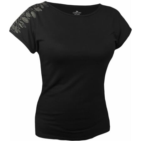 Dámské tričko se spadlými kimonovými rukávy a kulatým výstřihem, jemně olemovaným. Jednobarevný lístečkový potisk na pravém rameni.