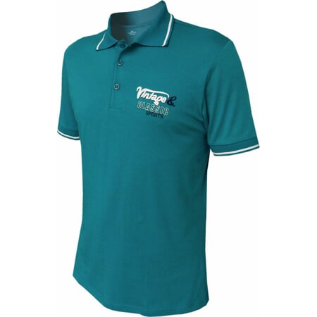 Pánská letní polokošile klasického střihu s krátkými rukávy, ukončenými manžetou, s pleteným límečkem a légou na tři knoflíčky. Vlevo na prsou je natištěný dvoubarevný motiv. V kraji límečku a manžet je vypleten kontrastní bílý proužek.