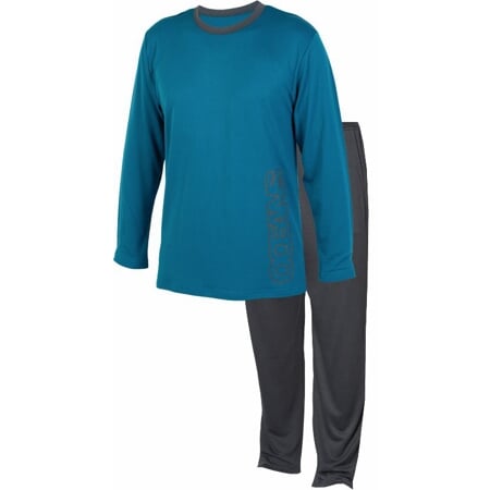Funkční pánské pyžamo s dlouhými rukávy a nohavicemi. Tričko je rovného střihu, bez lemů a má kulatý výstřih olemovaný tmavší kontrastní barvou, shodnou s barvou kalhot. V téže barvě je na levém boku natištěný svislý nápis. Dlouhé kalhoty rovného střihu jsou tmavšího odstínu a mají pružný pas s možností regulace délky pruženky.
