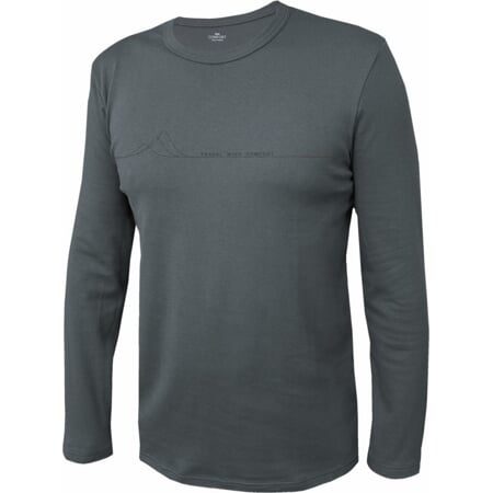 Pánské tričko klasického střihu s dlouhými rukávy bez lemů, kulatý výstřih je olemovaný. Přes prsa je natištěný jemný vodorovný motiv.