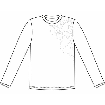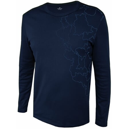 Pánské tričko klasického střihu s dlouhými rukávy bez lemů, kulatý výstřih je olemovaný. Levou stranu zdobí jemný jednobarevný motiv.