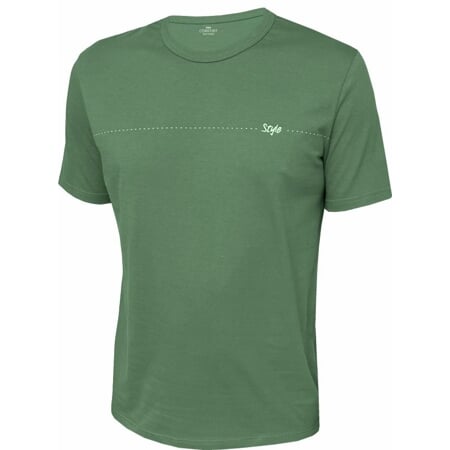 Pánské tričko z biobavlny. Inovovaný klasický střih s krátkými rukávy a kulatým výstřihem. Přes prsa je natištěný jednobarevný vodorovný motiv. Výstřih je olemovaný pružným materiálem.