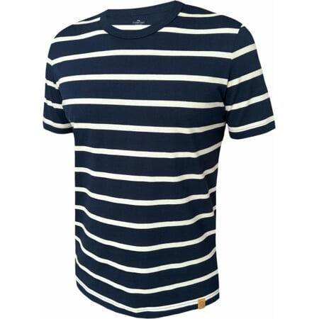 Pánské tričko ve větších velikostech. Klasický střih s krátkými rukávy a kulatým výstřihem, který je olemovaný pružným materiálem. Slušivý proužkovaný dezén - oblíbenou tmavě modrou barvu úpletu doplňují proužky ve světle béžovém odstínu. Svěží vzhled doplňuje ozdobná etiketka v přírodních odstínech béžové.