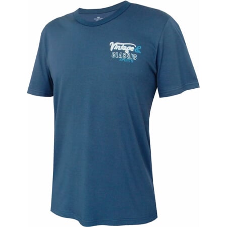 Lehké pánské tričko klasického střihu s krátkými rukávy a kulatým výstřihem. Vlevo na prsou je natištěný dvoubarevný motiv. Výstřih je olemovaný pružným materiálem ve shodné barvě.